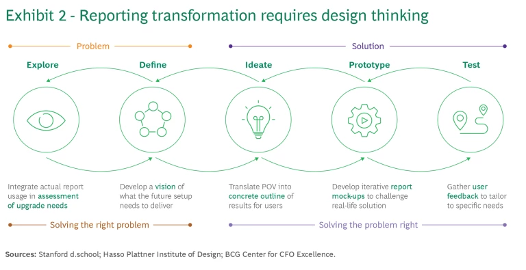 Most of the above quantum-leap tactics put the human element front and center. That’s why future reporting rework should follow a design thinking approach. (See Exhibit 2.) Design thinking is a method developed at Stanford’s d.school for solving “wicked problems” in a people-centered way. Reporting redesign is a classic “wicked problem”: customers cannot clearly articulate what they need, the requirements are not easily understood, and the solution is best developed in an iterative way.
