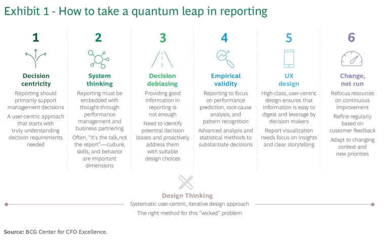 The future of reporting needs to be totally different from what it is today. Reporting can take a quantum leap by systematically incorporating the following six next-level tactics. (See Exhibit 1.)