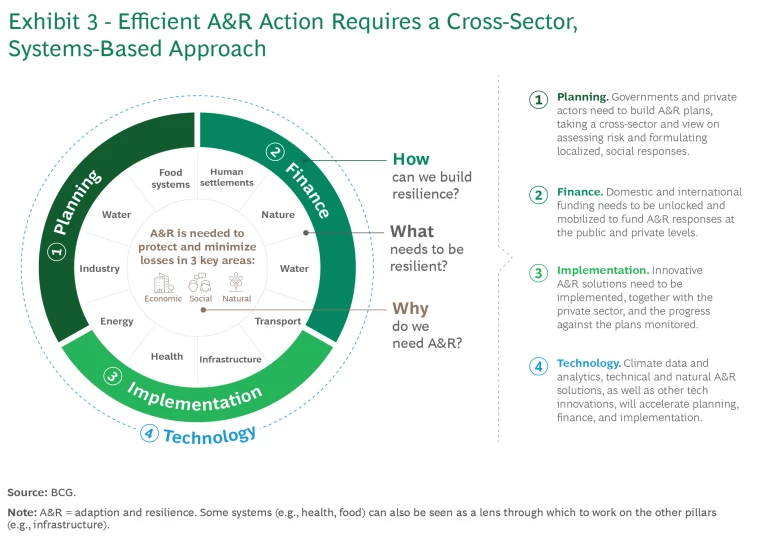 The bottom line is that it is important for banks to not just assess climate change but to address it—and the benefits for banks go beyond growing the business. A systematic approach to adaption and resilience (A&R) financing will make their own portfolios more resilient from a climate physical risk perspective. It will also help them comply with regulatory requirements, which increasingly include monitoring and managing this type of risk. Efficient A&R action requires a cross-sector, systems-based approach, including the planning, financing, and implementation of A&R solutions. (See Exhibit 3.)