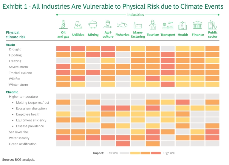 As the planet grows warmer, no industry will be spared from increasingly frequent supply chain disruptions, operational interruptions, and reduced productivity. (See Exhibit 1.)