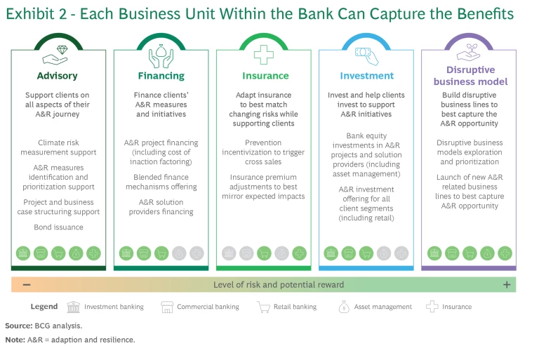 As industries across the globe will feel the effects of climate change and work to adapt their operations to build resiliency, banks have a critical role to play in this effort. Those that apply their data and evolve their products and services to help companies address climate change stand to benefit in what is shaping up to be a multitrillion dollar market.