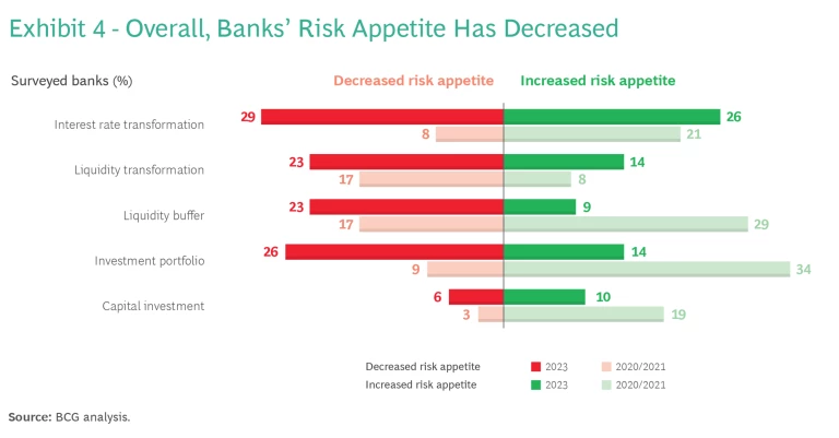 In addition to enhancing the operating model, treasury departments continue to focus on strengthening and optimizing their balance sheets. The steps they have taken show the diverse ways in which banks are handling their risk appetite. There has been a slight overall decline in risk appetite since the 2020–2021 survey, a trend most noticeable in banks’ investment portfolios. At the same time, the percentage of banks in our survey that have increased their interest rate risk is almost equal to those that have decreased it. (See Exhibit 4.)
