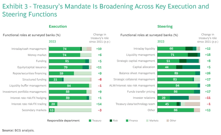 Expanding Mandates. Efforts to evolve the treasury operating model are especially important given the expansion at many banks of the treasury department’s mandate across both execution and steering. (See Exhibit 3.) While some execution functions—such as funding (a treasury responsibility at 85% of banks in our survey) and the management of liquidity buffers (94%)—remain a central mandate, others have grown considerably in importance. These include intraday/cash management (the share of banks in our survey where this is the responsibility of treasury departments has increased from 64% to 74% since the 2020–2021 survey), equity/capital issuance (an increase from 68% to 79%), and investment portfolio management (an increase from 79% to 88%). The broadened scope of treasuries’ mandate inevitably increases the complexity involved in managing resources across the bank’s departments and requires both clearly defined interfaces and responsibilities and strong cooperation among departments.