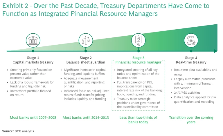 How bank treasury departments operate has changed dramatically over the past 20 years. Two decades ago, they focused largely on capital markets, cash management, and the execution of transactions across the bank’s various departments. Since then, that role has expanded, and treasuries have become key players in guarding the balance sheet, many functioning as financial resource managers as they move toward becoming real-time treasuries. (See Exhibit 2.)