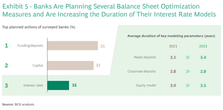 The top priority in balance sheet optimization is funding and deposit management, cited by 35% of respondents. This reflects the current “war for deposits” among banks. The second most common measure is capital management, cited by 32%, while 15% of banks are working to improve their modeling of the duration of both deposits and equity to improve interest rate risk management. On average, banks are modeling retail deposits over more than three years’ duration and corporate deposits for just under three years, a slight increase from past years. The duration of their equity interest rate models has also increased, from three to three and a half years. (See Exhibit 5.)