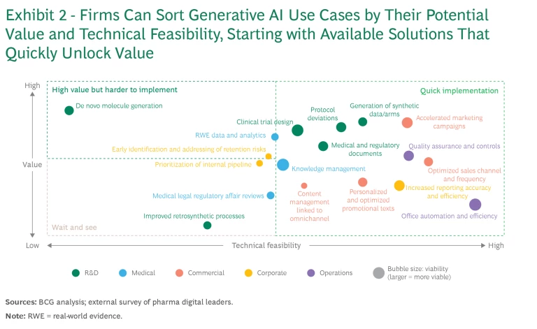 BCG and Microsoft complemented the study with a survey targeting leading digital senior executives at 15 of the biggest global pharmaceutical firms. The results confirmed the firms’ strong interest in GenAI use cases but also reinforced the importance of making smart portfolio choices from the start.