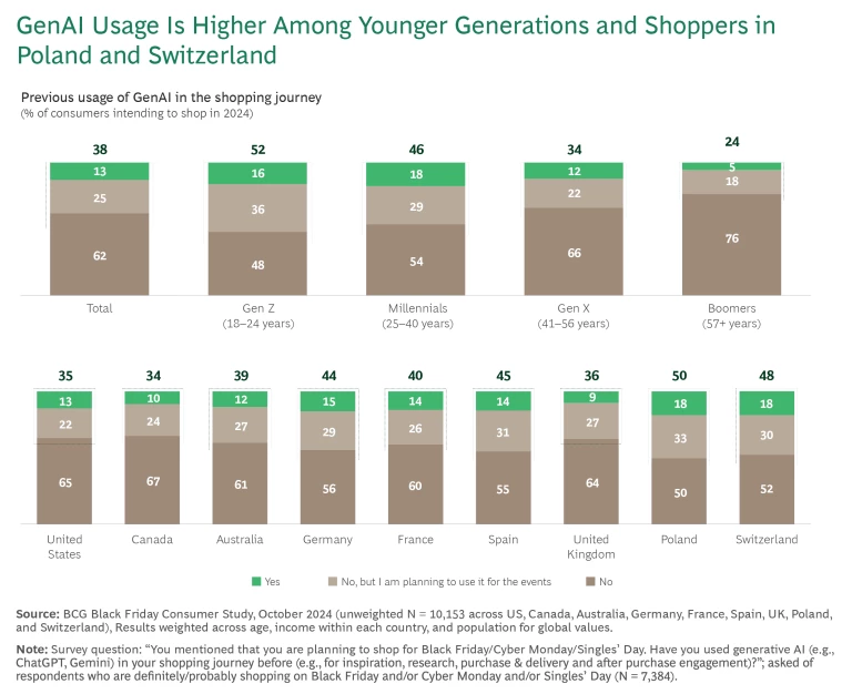 More than a third of consumers (38%) have already used GenAI in their shopping journey or are planning to use GenAI to shop during Black Friday, Cyber Monday, and Singles’ Day.