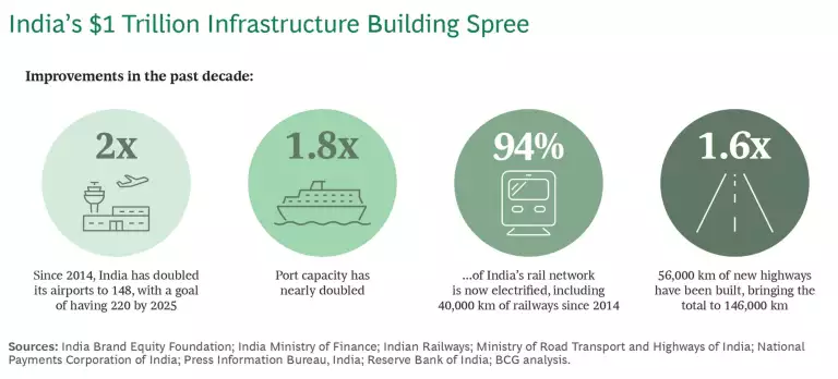 Case in point: infrastructure. India has spent $1 trillion over the past seven years doubling its airports and port capacity, electrifying its railways, and building 56,000 kilometers of new