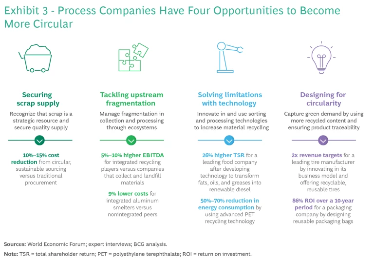 By becoming circular, process companies (such as producers of metals, cement, and chemicals) can reduce volatility and other risks in their supply chains and lower costs, compared with their competitors. By solving critical circularity challenges, companies can differentiate their products and build stronger connections with customers and suppliers.