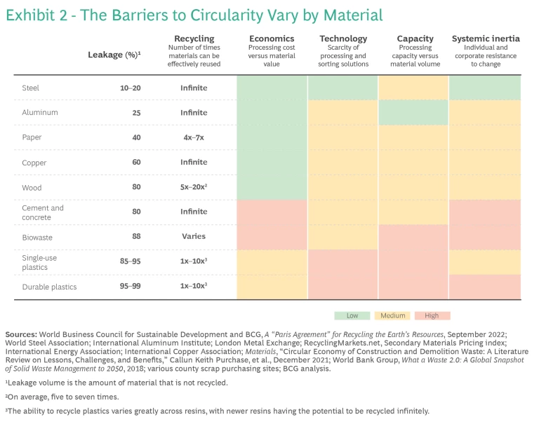 If circularity was easy to achieve, companies would have already embraced the concept. But barriers stand in the way. The barriers vary by type of material. They can include economic barriers if the cost of processing outweighs the value of the recycled materials, technical barriers if sorting or processing solutions are scarce, capacity barriers if there are fewer facilities than materials to recycle, and systemic inertia barriers if individual and corporate behaviors are resistant to change. Recycled materials will never fully replace virgin materials, but by improving the mix, companies can gain an edge. (See Exhibit 2.)