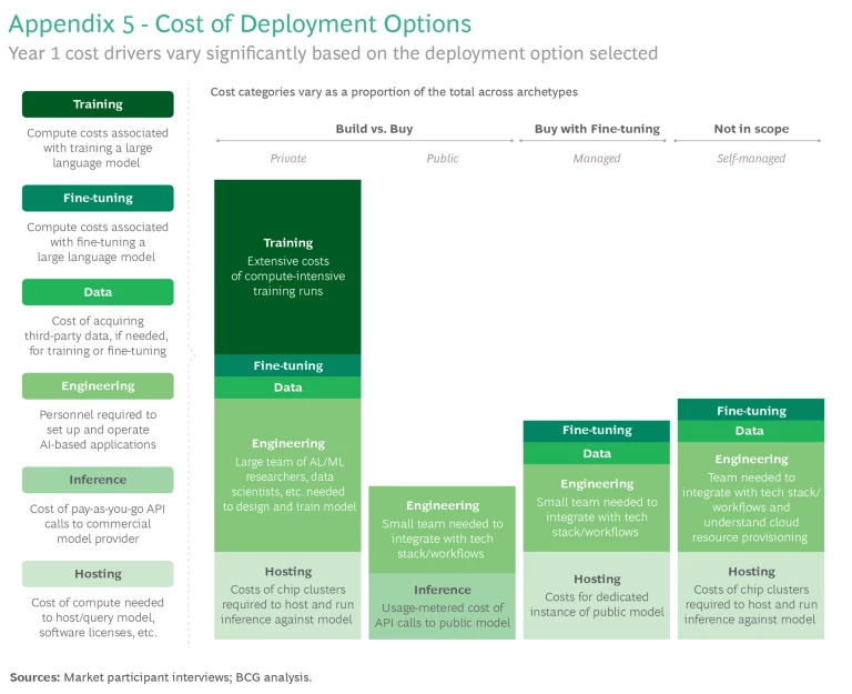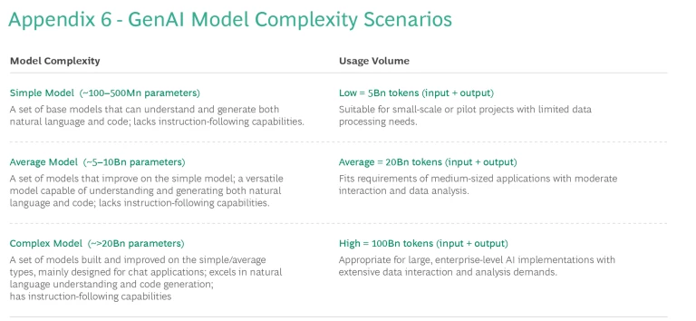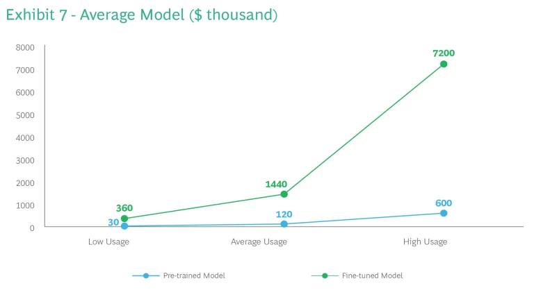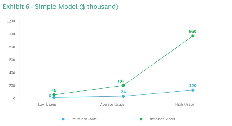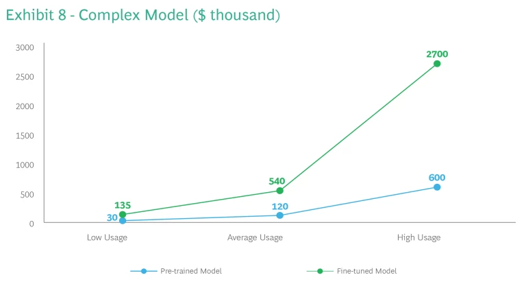 As model complexity escalates, so does the cost of fine-tuning—from a mere 0.032 million USD for a simple model, to 0.48 million USD for an average model, to 0.64 million USD for a complex model. (See Appendix 5 for model complexity scenarios.) Once built, there’s an exponential increase in the resources needed to run the models across all usage tiers. Interestingly, while usage costs escalate from pre-trained to fine-tuned, the scale of the increase for complex models is less drastic (4.5x) compared to simple models (8x) and average models (12x). (See Exhibits 6-8 slideshow).