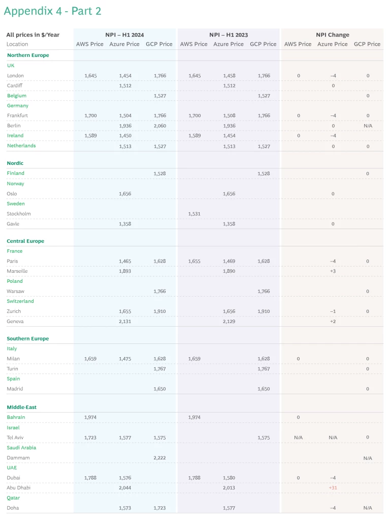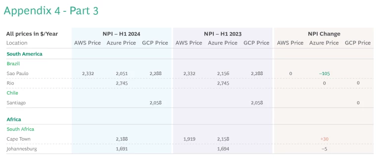 Meanwhile, GCP’s addition of Dammam gives it the first location in Saudi Arabia, though on the expensive end of the spectrum ($2,222/year)—similar in cost to Brazil and South Africa. GCP also debuted in Doha with a rate of $1,723/year, which is $150/year less than Azure, the other provider in the region. Also, in the first half GCP added Berlin, once again in competition with Azure, but with less competitive rates at $124/year higher than Azure. Finally, GCP became the first provider with three hubs in the US, adding South Carolina to Virginia and Ohio.
