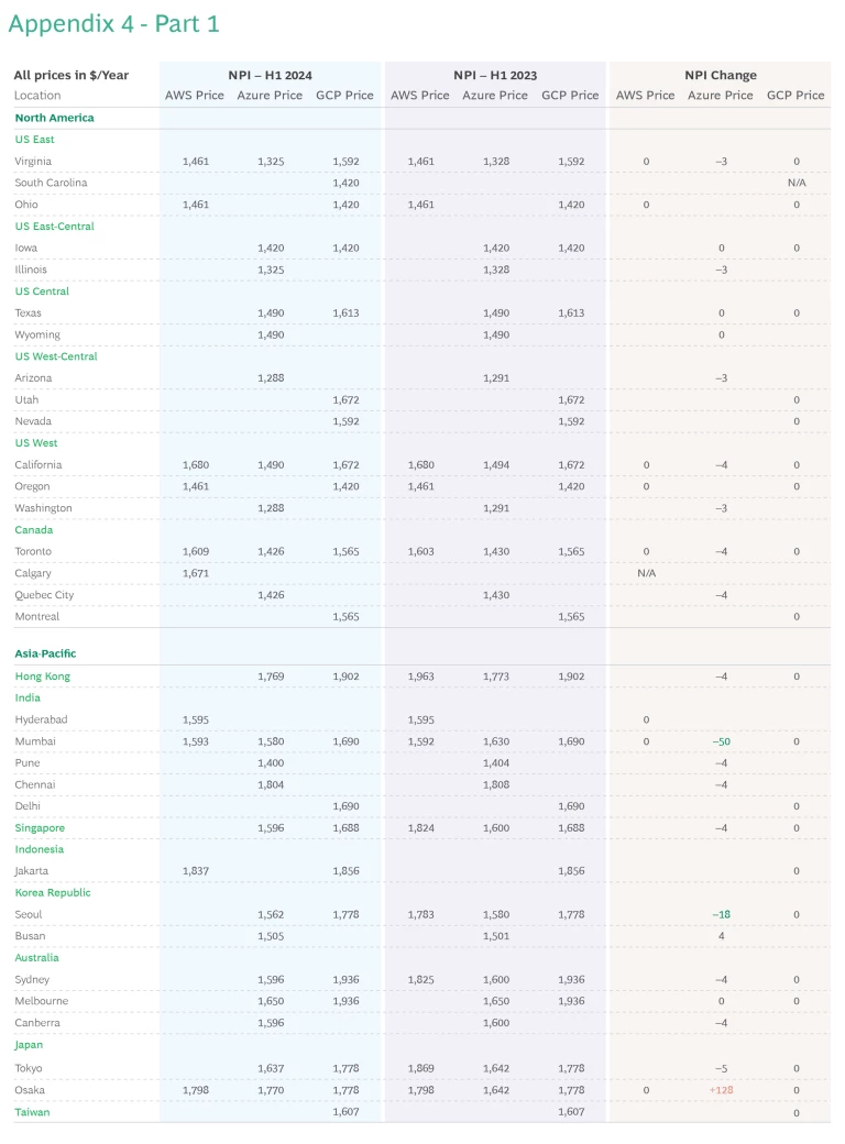 Azure was the only CSP that changed rates in existing locations in the first half of 2024, driven by adjustments in compute rates. (See Exhibit 1.) Storage and network rates remained consistent. Globally, Azure’s pricing adjustments resulted in mostly small changes in each region. The most dramatic swings occurred in Osaka (+$128), Abu Dhabi (+$31), Cape Town (+$30), Mumbai (–$50), and São Paulo (–$105). Even with the substantial Osaka rate increase, Azure still offers the lowest rates in that city. Moreover, its competitive pricing in Tokyo means Azure is the most affordable CSP in Japan.