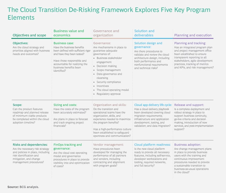 - Scope and Objectives. Are the cloud transformation program’s scope and objectives clear, and have we ensured that they will continue to be relevant as business priorities evolve?
