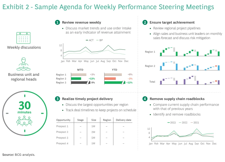 Leaders pair strong incentives with strong performance management within their companies and across their partner networks. Maintaining a regular review cadence or “sales drumbeats” can help machinery and automation companies create a performance culture. A hydraulics manufacturer instituted a year-long “sales push” program. Managers set up weekly drumbeats for each region and business unit where they reviewed revenue and order intake and other KPIs, refreshed targets and account priorities, and resolved roadblocks. (See Exhibit 2.) Distributors and resellers were included in the drumbeats and seen as an extended sales arm. This weekly cadence increased accountability throughout the sales funnel and resulted in significantly more leads, quotes, and revenue. In our experience, a best-in-class setup can increase inbound leads by 10% to 25%, improve lead-to-opportunity conversion rates between 1.5 and 3 times, and reduce sales cycle times by 10% to 20%.