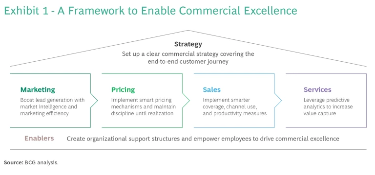 Over the last several months, BCG surveyed more than 20 machinery and automation companies—many of them major global players—examining each dimension of commercial excellence and approaches to strategy development, services, and underlying enablers. (See Exhibit 1.)