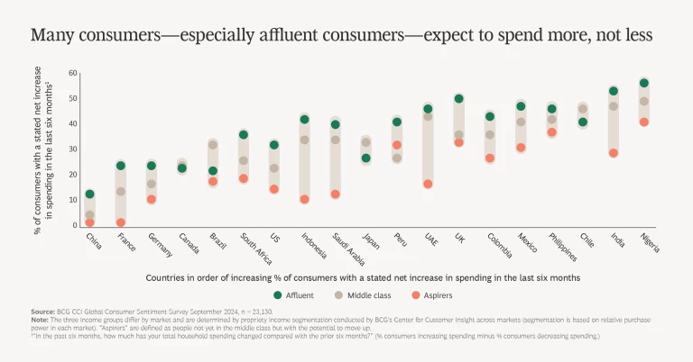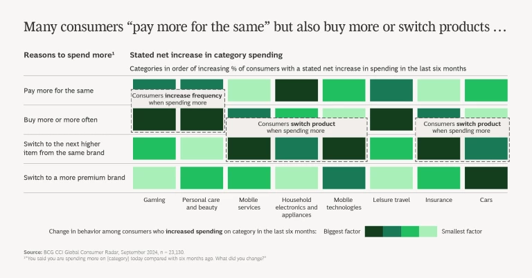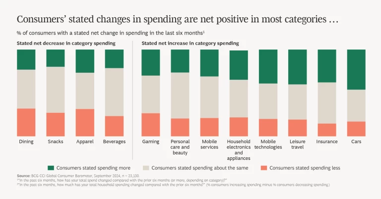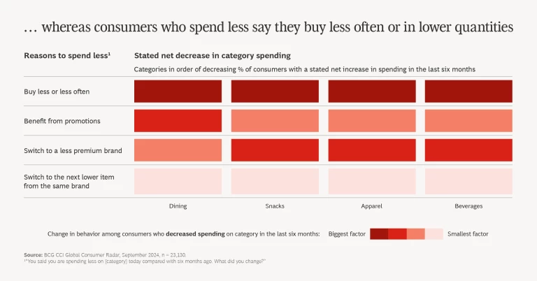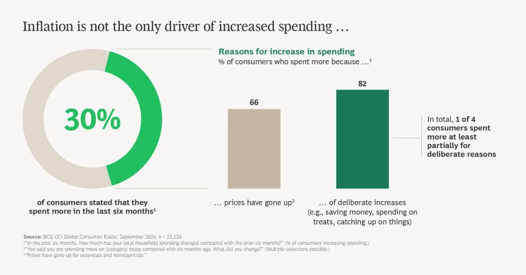 Thirty percent of survey respondents told us that they are spending more across the categories we researched. They cite higher prices as one reason for the uptick in spending, yet 80% actually opt to spend more. Overall, this means that one of four consumers across markets increase spending because they choose to do so.