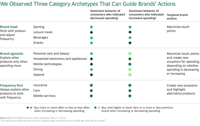 But our research shows that when consumer spending shifts, for whatever reasons, brands can develop growth strategies. (See “About Our Research.”) The key is to understand those reasons: What motivates consumer behaviors? Changes in consumer behavior involve shifts in purchase frequency and willingness to explore new products—trading up, within the brand or beyond it. Brands can respond by finding ways to maximize uptake of their products and tailor touch points to encourage the most relevant purchases.