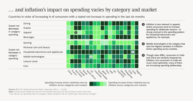 Inflation impacts consumers around the world. It correlates with higher spending but differs across categories and markets. For example: