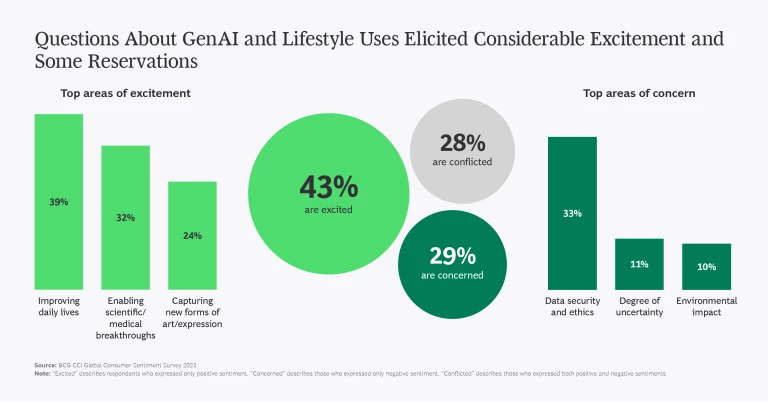 Then, as consumers learn more about AI and interact with apps like ChatGPT or AI-enabled shopping recommendations, they get excited about the possibilities—the “three Cs” that AI promises. But the growing understanding that comes from greater experience quickly surfaces more thoughtful concerns, different from their original fears. Among them: Could we become too reliant on AI? Could my own job come to be at risk? Is my data going to be compromised?