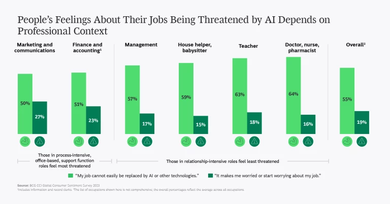 Those who feel most vulnerable are in marketing and communications as well as in finance and accounting, areas with jobs that tend to be process-intensive support roles that can perhaps be automated. At the other end of the spectrum are people in relationship-intensive roles; these individuals report feeling less threatened by AI.
