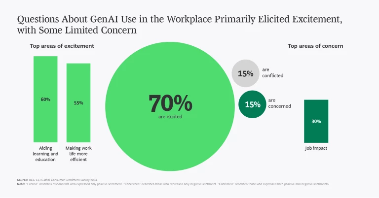 Consumers see the value the technology can bring, particularly to improve their daily lives, with 39% responding positively about AI’s influence on this factor. Excitement about AI in the workplace is high too: 60% see that AI will help with learning and education, and 55% anticipate workplace efficiencies. (For more results, see “Consumer Perspectives About AI in the Workplace.”)