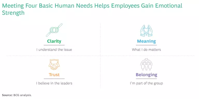 Given what’s at stake, it’s plain to see the benefits of boosting the emotional strength of the workforce. Doing so requires meeting four fundamental human needs. (See the exhibit.)