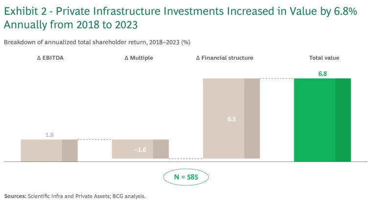 Although opportunities for future investments in infrastructure are numerous, the key to generating strong returns lies in boosting operational performance. Our analysis of performance data for 585 infrastructure companies held in private portfolios shows that annual total shareholder returns on these investments averaged 6.8% from 2018 to 2023 across all investment strategies. That’s an impressive figure, given the challenging economic conditions that investors faced during this period.