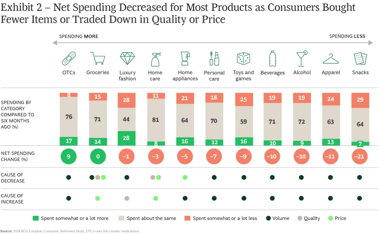 The difference resulted in people reporting higher basic and discretionary spending. Over-the-counter medications—a necessity people can rarely forgo—was the only product category surveyed with a net spending increase, of 9% for the first half of 2024. Net spending on groceries was unchanged. (See Exhibit 2.)