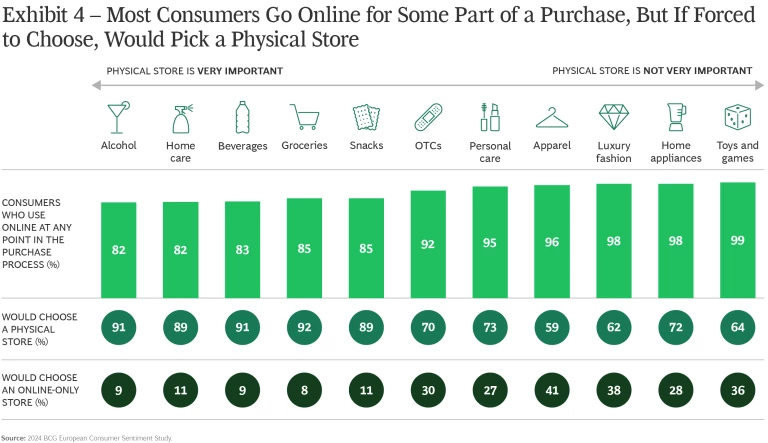 People’s preferences for online- or physical-only stores are closely tied to what they’re buying. They have a strong preference for shopping at a physical store for frequent purchases such as alcohol, home care products, groceries, and snacks because of the convenience or price, or because they may prefer getting help from a flesh-and-blood salesperson.