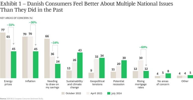 Energy prices and inflation top the national issues Danish people are most concerned about. But even those worries have subsided from what they were in our 2022 and 2023 consumer surveys. (See Exhibit 1.)