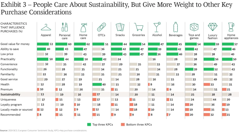 The disconnect between what consumers say and do springs from the factors they consider important when they shop. Danish people aspire to be green but place greater value on more traditional key purchase criteria, including getting a good deal, saving money, low price, and practicality. (See Exhibit 3.)