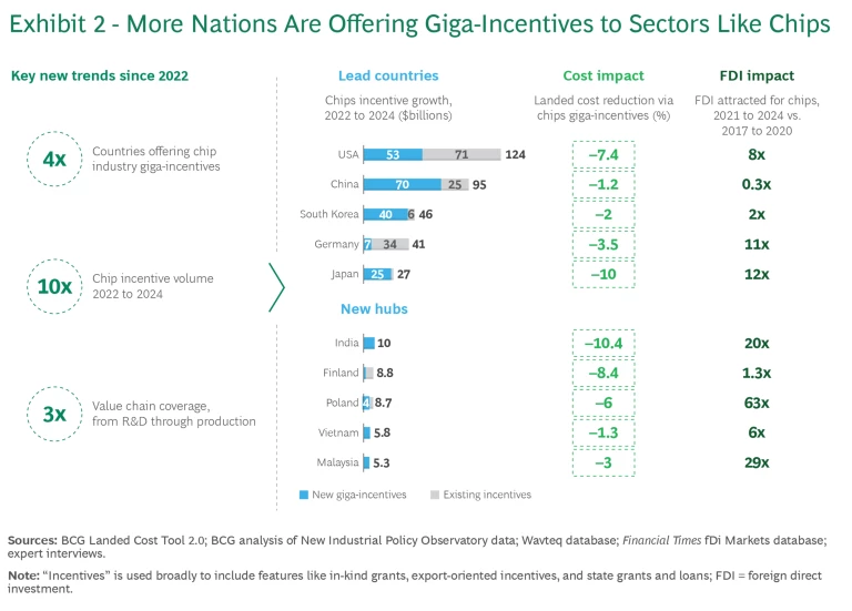 These giga-incentive initiatives tend to have several common objectives: to empower companies to produce domestically, to stimulate consumer demand for certain goods and services, to secure a supplier base that can support targeted industries, and to encourage companies to achieve certain standards, such as in environmental sustainability. Another objective is to increase a nation’s global competitiveness in a strategic sector and its attractiveness to foreign investors. Giga-incentives have lowered the landed cost of domestically manufactured chips by anywhere from around 1% to more than 10%. They have also enabled nations to dramatically increase foreign direct investment (FDI) in the chip sectors—by around eight times in the US, more than ten times in Germany and Japan, and more than 60 times in Poland.