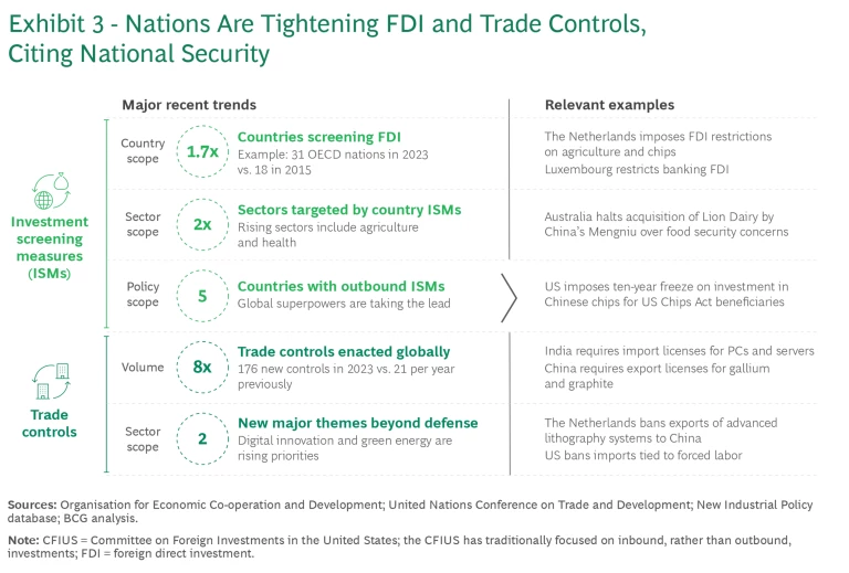 Broader Trade and Investment Restrictions in the Name of National Security. Governments are citing an increased national interest in deploying restrictions on commercial trade and investment—a move traditionally reserved for defense industries. For instance, a country might place restrictions on exports of dual-use technology, such as semiconductor manufacturing equipment and advanced chips used in AI. We’ve also seen growing scrutiny of both inbound and outbound FDI. (See Exhibit 3.)