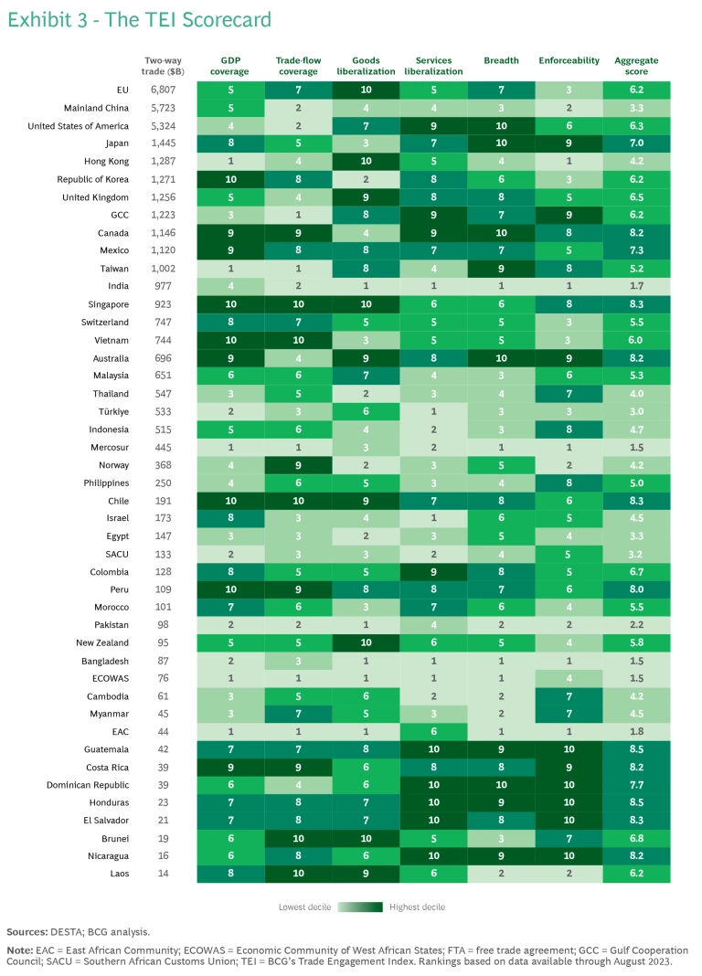 We’ve compiled the TEI scores of over 40 governments and trade blocs to show how their trade agreements compare across our six measures of trade engagement and effectiveness. (See Exhibit 3.)
