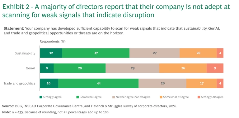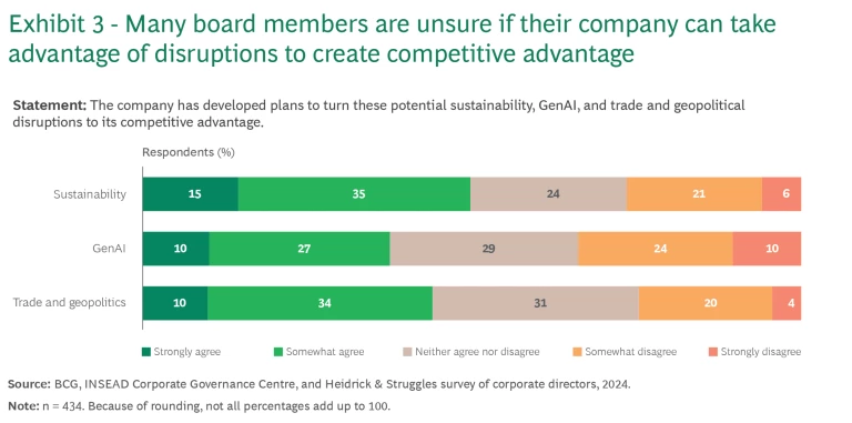 Understanding the changes that are occurring is one thing. It is quite another to “look around corners” and anticipate how major trends may evolve and then set a path to translate those shifts into competitive advantage. Roughly half of directors are not confident that their company has the muscle to scan the horizon for new threats or opportunities connected to sustainability, GenAI, and trade and geopolitics. (See Exhibit 2.)