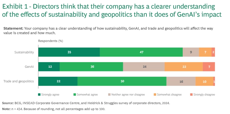 We asked directors whether their company has a clear understanding of how sustainability, GenAI, and trade and geopolitics will affect the way value is created and how much. A healthy majority say they strongly or somewhat agree that their company has a clear understanding of the effects of sustainability and trade and geopolitics. But when it comes to GenAI—which has emerged relatively recently as a critical factor—the directors have less confidence in their company’s understanding. (See Exhibit 1.)