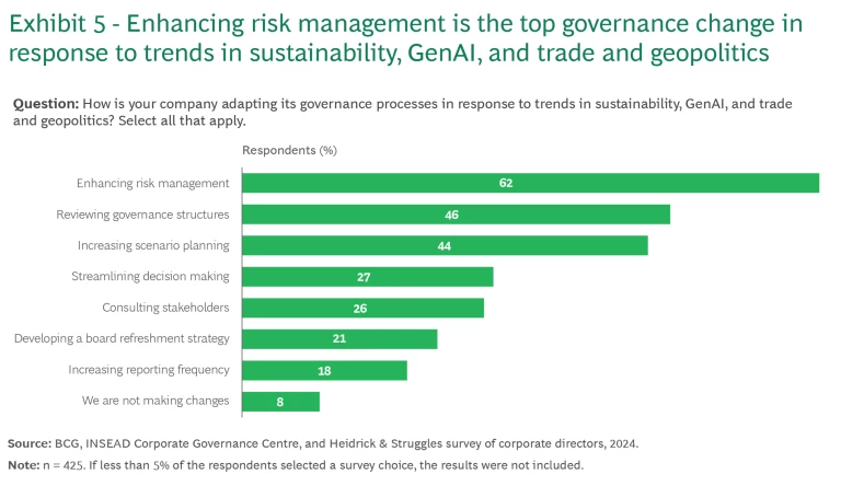 At the same time, more than 60% of directors report that their board is enhancing risk management, making it the top governance change. (See Exhibit 5.) And a full 44% of respondents report that their board is increasingly conducting scenario planning—an encouraging sign.