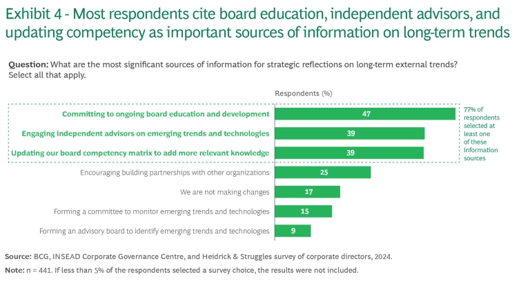 When asked what boards are doing to adapt to disruptions around sustainability, GenAI, and trade and geopolitics, the top three actions directors cite include adapting the competency matrix, along with ongoing education and engaging with independent experts. (See Exhibit 4.)