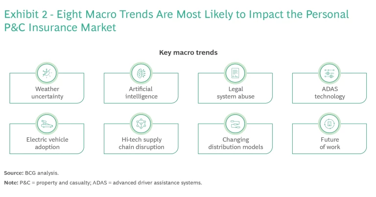 Assess macro trends and drivers of uncertainty. P&C executives face some existential questions, such as How will continued advances in private passenger vehicle technology impact driving patterns, loss frequency, and severities? Will the growing third-party litigation funding market significantly accelerate liability losses? Are there any legal or regulatory interventions that will slow this trend?