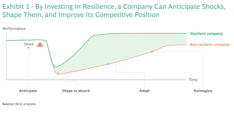 By “resilience” we mean the capacity to anticipate shocks, shape or absorb the impact on a company’s offerings, adapt to exploit new opportunities or recover critical functionality, and reimagine the business in altered circumstances. (See Exhibit 1.) Traditional planning too often views risks only as challenges and misses the opportunities they can offer. As a result, management tends to cede the initiative instead of seizing it.