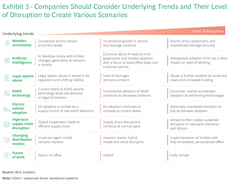 For example, one scenario that might incorporate these trends could be “extreme regulation.” Imagine that stricter consumer protection-oriented regulation emerges that makes innovation (such as AI or novel data usage) more difficult and expensive. As a result, underlying technology advancements relating to vehicles or other forms of disruption slow down while profitability challenges for insurers continue to grow due to other underlying trends (such as weather uncertainty and legal system abuse), leading to a solvency crisis.