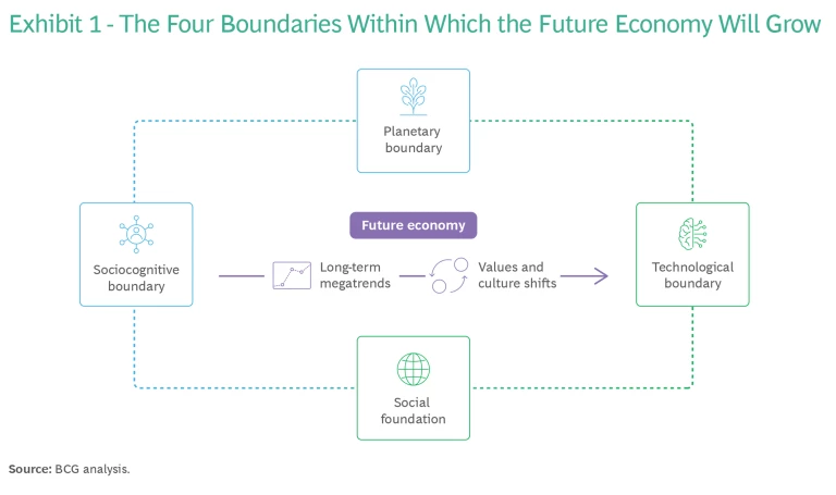 - Planetary Boundary. This boundary defines the environmental health that sustains humanity and enables it to thrive. Today’s economy violates this boundary with high carbon emissions and unsustainable manufacturing processes, and the situation could get worse. A scenario in which we humans cross this boundary too frequently—or exceed it to such an extent that we reach a point of no return—could cause critical damage to the planet.