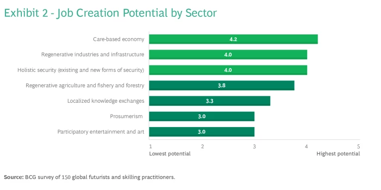 When leaders build economic models based on these priorities, a range of sectors with significant job-creating potential could emerge in the long-term future. (See Exhibit 2.) Several sectors are especially noteworthy in this regard.