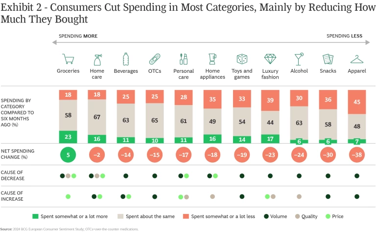 As inflation drove up prices, French consumers responded by spending more on basics (37%). Unsurprisingly, groceries was the only category of the 11 product types we studied with a net spending increase for the first half of 2024 (5%) despite the fact that people reported trying to trim grocery costs by buying less, looking for deals, and switching to lower cost brands. (See Exhibit 2.)