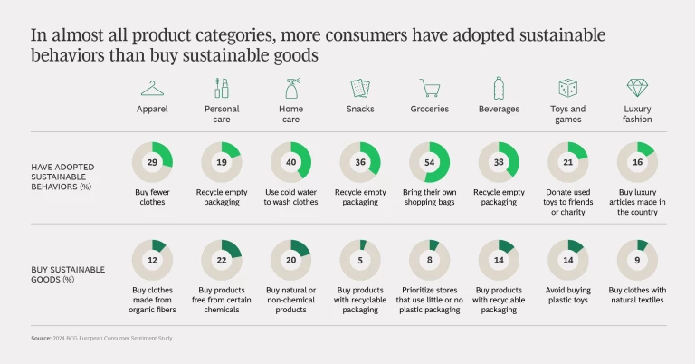 But sustainability habits only go so far—especially when people are feeling squeezed. More French consumers report having adopted sustainable behaviors than buying sustainable goods. Of consumers who said they buy sustainable products, the largest portion purchase personal care or home care items made with natural products or that are free from chemicals (22% and 20% respectively).