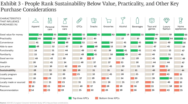 One reason that sustainability isn’t a bigger factor is the higher worth that consumers still place on more traditional purchase criteria, including good value for the price, functionality, and convenience. (See Exhibit 3.)