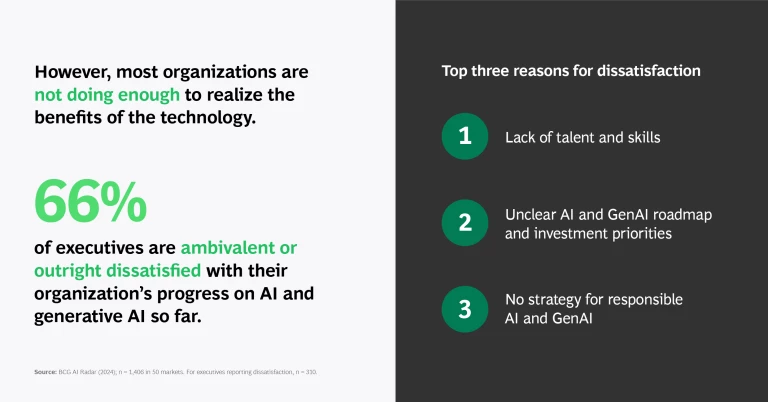 Although the uptick in investment is promising, most organizations aren’t doing enough to realize the full benefits of AI. The executives who expressed dissatisfaction with their organization’s progress on AI and GenAI highlighted several challenges, including a shortage of talent and skills (62%), unclear investment priorities (47%), and the absence of a strategy for responsible AI (42%):