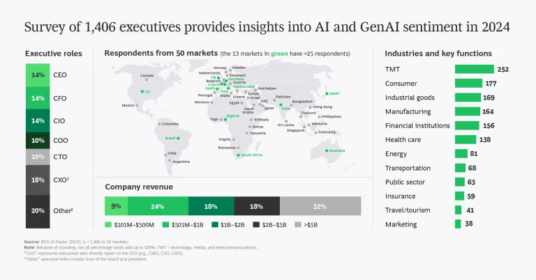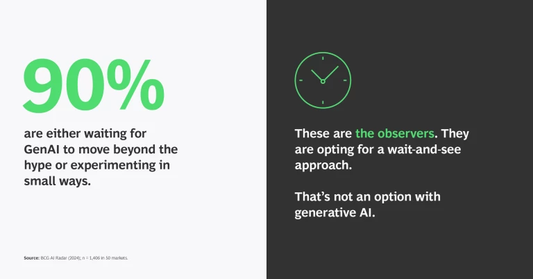 BCG’s survey of 1,400+ C-suite executives reveals that GenAI is quickly changing the way companies do business—but 90% of leaders are still waiting for it to move beyond the hype or pursuing limited experimentation.