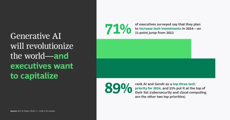 - 89% of executives rank AI and GenAI as a top-three tech priority for 2024.